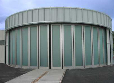 The functionality of sliding doors can be optimised with a large range of extra equipment. The variants range from diverse tail doors to integrating pass doors up to the diverse door fillings. Aside from fibreglass various combinations with other materials, like, for example, sandwich panels or trapezoidal sheet metal, can be realised. By using curved tracks Butzbach doors can be installed in round buildings, for example in hangars for helicopters.